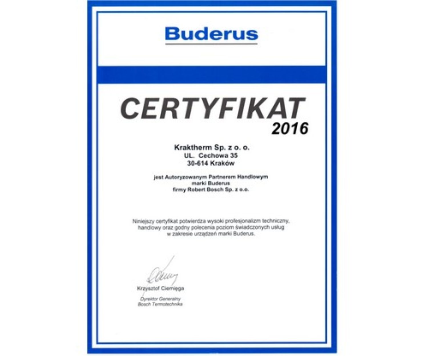 Aktualności 21 sty 2016 CERTYFIKAT BUDERUS 2016Jest nam niezmiernie miło, że współpraca z marką Buderus kwitnie. Przed nami kolejny pracowity sezon, którego efektem będzie nie tylko zadowolenie… kraktherm